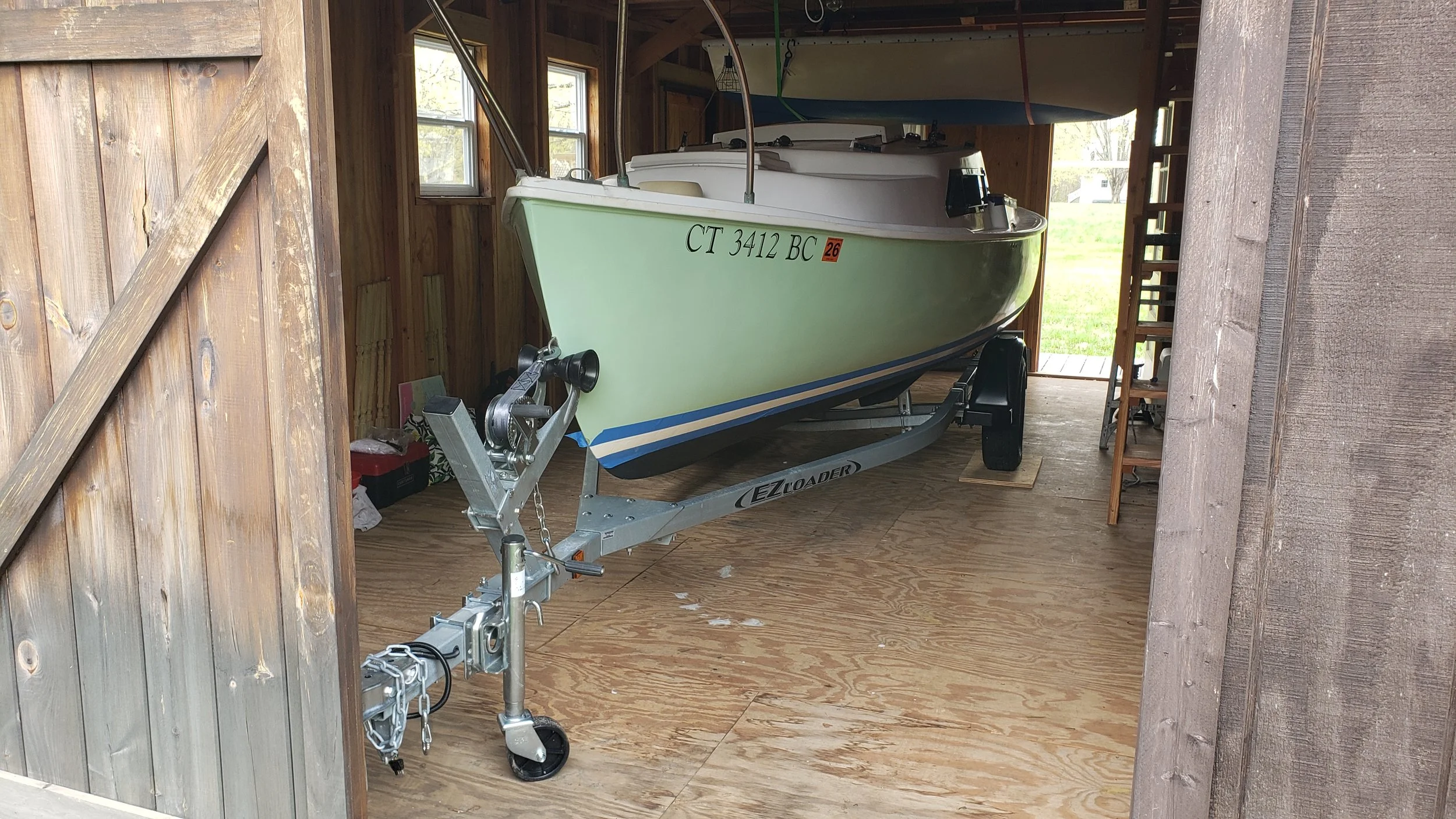 On the new trailer and back inside the boatshed.
